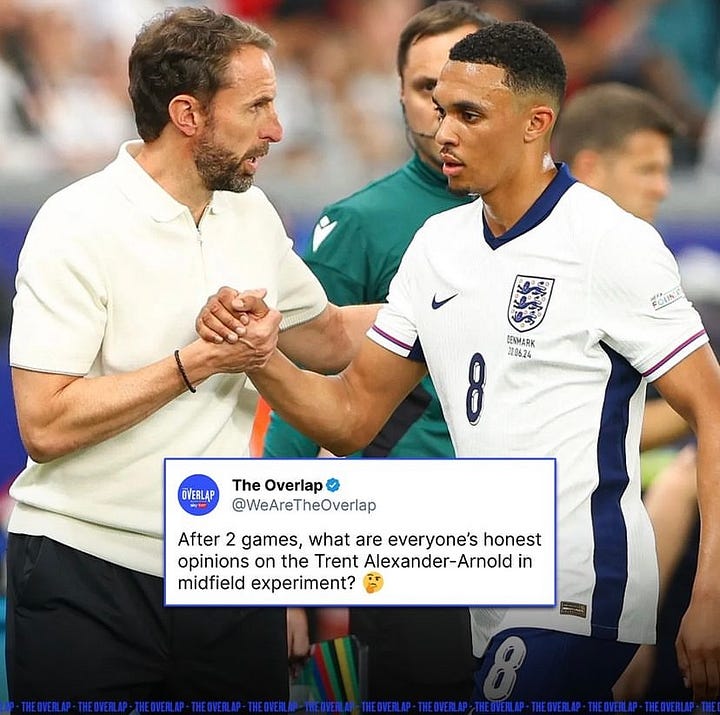 Never seen a formation like that. Crazy. What manager in World Football has ever played that. There is zero balance to the team. You are basically asking Saka to play the whole of the left side of the pitch. Never going to happen. The players want to play in a back four and all Englands best performances have been with a back four. This tournament the defence has been the best part of the team. There have been no real weaknesses. Why change. Trent can’t play on the team. He is not better than Walker at RB. Not bringing a natural left back like Mitchell has been a massive mistake though. Picking the unfit Shaw for a Euro’s is crazy. Not played since Feb and won’t get to match fitness during this tournament.